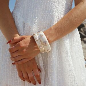 This elegant bangle features a beautiful cream base adorned with gold shell accents. Perfect for adding a touch of sophistication to any outfit.