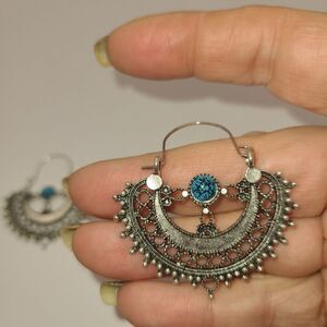 NWOT. Beautiful. ethnic boho style silver earrings. Silvertone with faux turquoise stones. Really pretty! Lightweight.