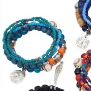 Set of (5) stackable bohemian-style stretch bracelets in turquoise tones with silver-tone charms. Each bracelet can be worn alone or layered together for a chic stacked look.