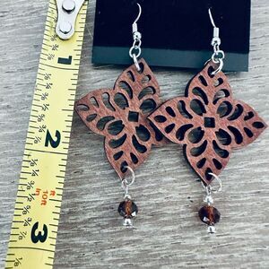 Beautiful rustic boho cutout medallion wooden earrings in new condition. Small brown bead at bottom. Very lightweight.