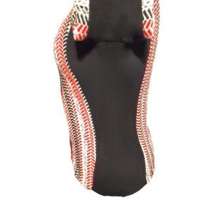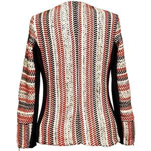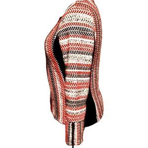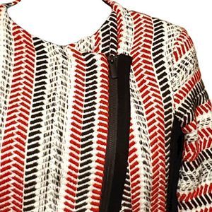 Unique "rag" woven jacket with strips of fabrics in red, black, and white. Two side panels and the bottoms of the sleeves are a black ribbed cotton blend with some stretch. Pictured. Slight Asymmetrical black zipper closure on front and matching zipper closures on cuffs (side view).