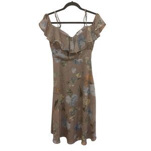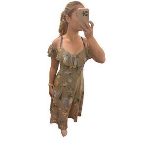 Boho-chic floral print dress with ruffled off-the-shoulder straps, featuring a lightweight fabric and a flowy silhouette.