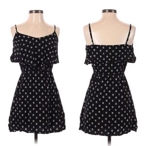 Beautiful black mini polkadot tulip dress. Ruffle hemline. Lavender polkadots. Spaghetti straps. Never worn only tried on. Like new.