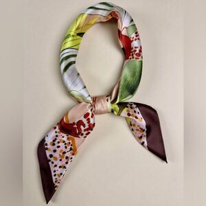 Elegant scarf featuring a vibrant floral and butterfly design. Perfect for adding a touch of color to any outfit.