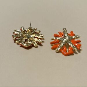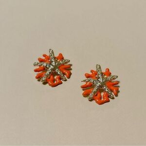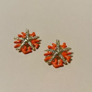 Orange enamel starfish boho vintage style dangle stud earrings in gold tone hardware