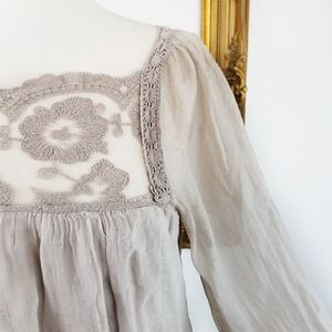 Romantic with poet sleeves taupe tan with lace panels front and back. Elastic closure sleeves. Silky gauze feel No name or size tag. See approximate measurements