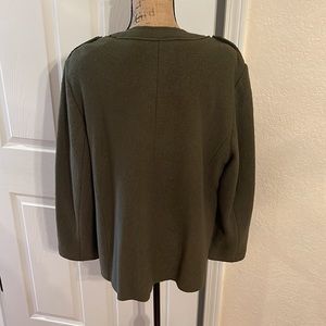Chico’s size 3 army green boiled wool jacket with front ruffles, shoulder tabs and button down NWT