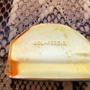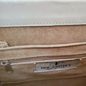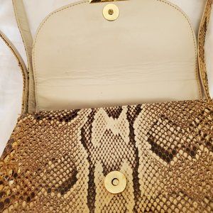 Beautiful luxury Bol-Perdix bag from Spain. Genuine snakeskin with dramatic markings. Gold snap closure. One inner zip compartment on an envelope compartment. Bottom, inside and inner straps are cream. 8" across top; 10 1/2" across bottom; 10" tall; 2" deep at top; 3 1/4" deep at base; straps approx. 30" fully measured from ends; 23 1/2" from top of strap to bottom of bag. Mint condition - little to no wear. This is a fabulous rare addition if you are a collector. Smoke free, pet free home.