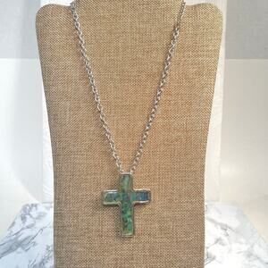 Bold Abalone & Silver Tone Cross, preowned. It is in nice condition. I think the abalone is suspended in resin, because of the open back construction.