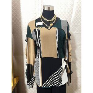 The geometric patchwork blouse features a rich blend of earthy tones—black, ivory, taupe, and deep forest green—combined in a modern art-inspired layout. With its soft, flowy fabric and delicate layered ruffle sleeves, this top adds movement and flair while maintaining a polished silhouette. The flattering V-neckline is ideal for showing off your favorite accessories, too!