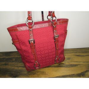 Y2K vintage Coach tote bag. Durable red Jacquard fabric with Coach pattern. Red patent leather trim. Great condition, clean interior/exterior. Minor handle wrinkling & marks on back (pictured).