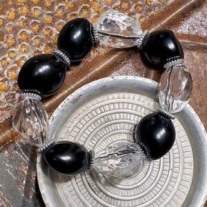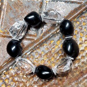Bold Chunky Faceted Clear Lucite and Nugget Black Kukui Nut Stretch Bracelet