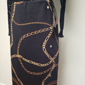 Black Gold Chain Skirt with Gold Button on the side. Form-fitting in XXL cut to curves measures 27" in length, 19" at wasit laid flat. Banded waist. Please note: Never worn, but has a bit of fabric pile on side of skirt (see photo).