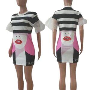 Bold Flutter Sleeve Stripe Red Sequin Lips Club Dress, Large