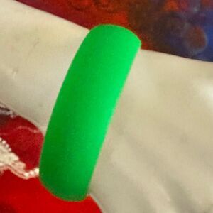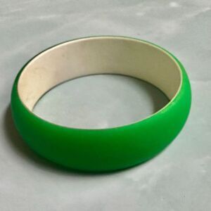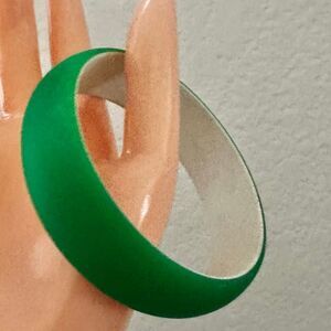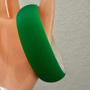 Make a statement with this chunky, solid-green bangle. Exterior is a bright, vibrant green resin with smooth, matte finish; interior is a lighter neutral tone. Classic solid bangle style—no hinge, seamless, modern look. Perfect for adding a pop of color to casual outfits or layering with metallic bangles for contrast.