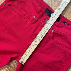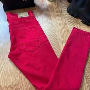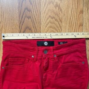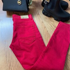 These vibrant red skinny jeans feature a slim fit that hugs the legs for a sleek silhouette. The material has a slight sheen, suggesting a comfortable stretch blend for ease of movement. Subtle wrinkling across the thigh area adds to their casual appeal.