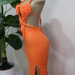 bright orange, halter neck, slit midi, statement piece, summer party, bodycon fit, bold color, cut-out detail, evening wear, standout style