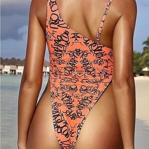This striking one-piece swimsuit features a vibrant orange base with bold black graffiti-style text, offering a modern and eye-catching design. The classic scoop neckline and high-cut leg line ensure a flattering fit, while the stretchy fabric provides comfort and ease of movement.