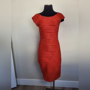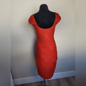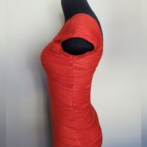 Stunning statement dress in a timeless cherry red color. Bandage style fit is form fitting and flattering. Material is stretchy and comfortable. Cap sleeves that can sit slightly off shoulder or not, and a low cut back neckline. Great condition. Tagged size small measures approximately 38.5 inches long 16 inches underarm to underarm laid flat 25 inch waist 34 inch hips at the widest point.