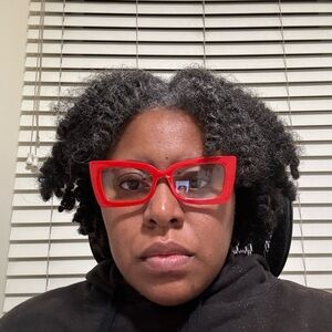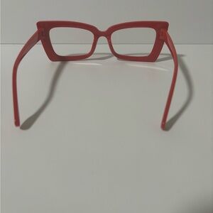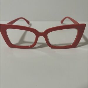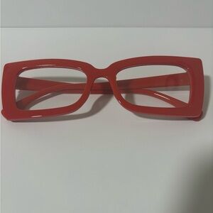 These eyeglasses feature a striking red color with a bold, rectangular frame design. Made from durable synthetic material, they offer a modern and fashionable look with their chunky, geometric shape. Perfect for making a statement, these glasses are both stylish and functional.