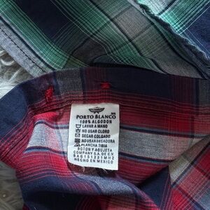 This casual button-down shirt showcases a striking plaid pattern in red and blue, crafted from a soft cotton blend for all-day comfort. Its relaxed fit and traditional collar make it a versatile choice for any casual occasion.