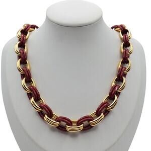 Thick, chunky street-style double link necklace. The chain has a heavy duty look but is lightweight. The links are gold tone and a dark red enamel (maroon) and it has a safety clasp.