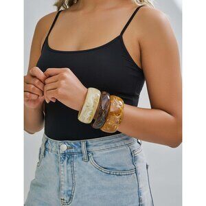 Features: This set includes three chunky acrylic resin bangles with a marbled swirl pattern, perfect for stacking or wearing solo. The irregular shapes and bold colors evoke that fun, free-spirited 70s vibe while remaining totally modern. Lightweight, durable, and comfortable all day.