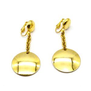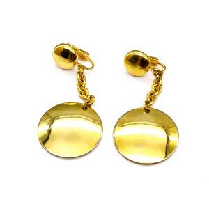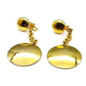Bold Vintage Dangle Earrings, Gold Tone Button Clip On Drops on Chunky Chain to Wider Disc, Minimalist Jewelry Basic
