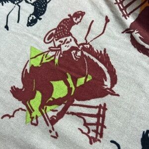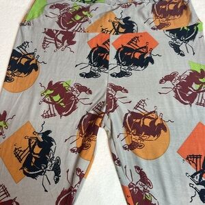 Make a statement with these unique Tall & Curvy LuLaRoe leggings featuring a bold western rodeo print. The design showcases classic cowboy imagery in earthy tones of burnt orange, maroon, and black, set against a soft gray background with geometric accents. Made in China from LuLaRoe’s signature buttery-soft fabric, these leggings provide comfort and flexibility for all-day wear.