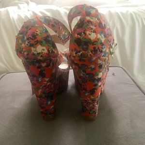 Although summer is almost over, these shoes can bring bursts of color into your wardrobe ! Features an open toe, cross cross straps and a chunky platform heel. What a sweet confection! Size 6.5, worn twice.