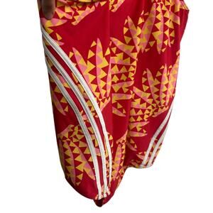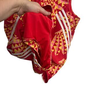 • Color: Red with yellow and pink geometric pattern, white Adidas 3-stripe accents