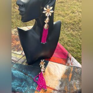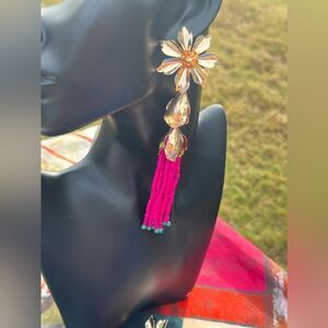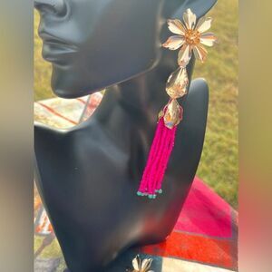 Elevate your style with these statement floral tassel earrings! A stunning combination of a metallic flower accent at the top, cascading down to bold, pink seed bead tassels, adding a vibrant touch to any outfit. The unique design is perfect for those who love a mix of elegance and playful color.