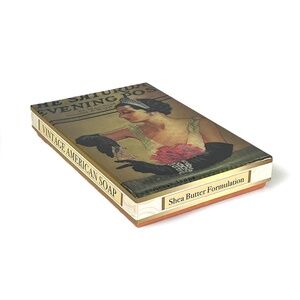 Shea butter soaps from that are triple milled and packaged in a box that has a Saturday Evening Post cover from 1933. There are 4 soaps in the set and each soap is 4 oz. Made by Bolero Beverly Hills, this set is new and still wrapped in the original packaging. Nice scent.