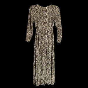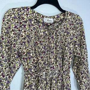 Pretty Cottagecore style dress with a floral print in shades of lime green, burgundy, and periwinkle on a beige background.