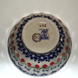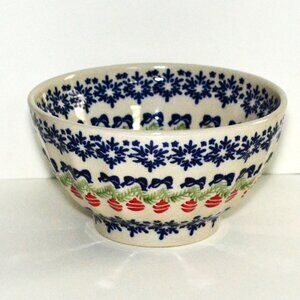 Infuse your holiday décor with artisan warmth using this handcrafted ceramic bowl from Bolesławiec, Poland. Featuring a vibrant garland of green pine boughs accented with red baubles and framed by cobalt bow motifs and floral bands, this 6-inch stoneware dish blends seasonal charm with timeless craftsmanship. Marked “Original Polish Pottery” and food-safe for oven, microwave, and dishwasher use,
