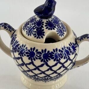 Boleslawiec Polish Ceramic Pottery Covered Sugar Bowl Bird Finial Peacock Poland