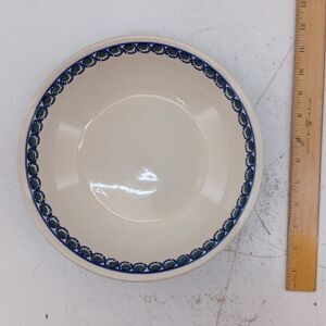 * Preowned 10.5" stoneware bowl with a Blue Lattice and Green Dot pattern.