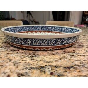 Boleslawiec hand painted Polish Pottery Oval Baking Dish in good condition. There is come crackling on either end (see photos)