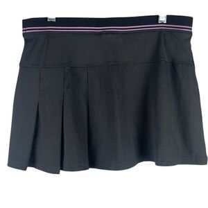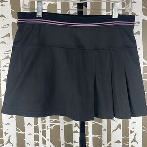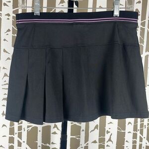 Additional Details: Flat striped elastic waistband, partially pleated skirt, built in shorts.