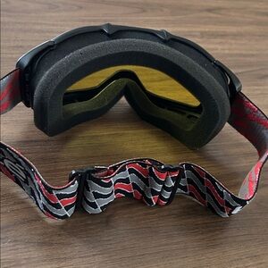 Belle ski goggles featuring a yellow lens and a red and black strap. Perfect for winter sports. Adult size. Nice condition