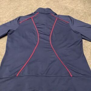 Stylish black jacket with red accents. Full zip front. Comfortable and versatile.