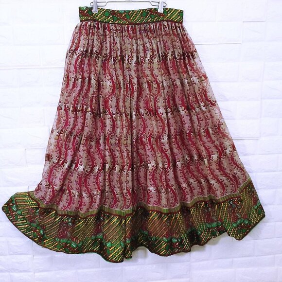 Unbranded Bollywood Wrap Skirt Sz-S Lined Double-Layered Wide stitched waistband with hook snap closure, Easy Care Washable Cotton? Gauze Muslin in wavy floral pattern shades of Purple Green Metallic.