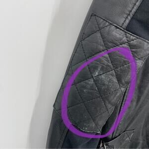 This jacket has some wear, but is in overall good condition, wear is mostly noticeable on quilted part of one sleeve and mark on back, see circled photos