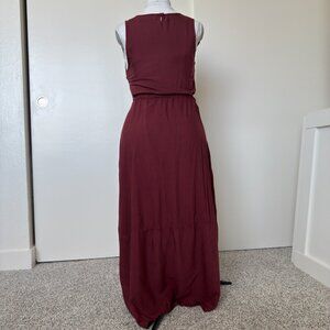 Size M, fits US 8. Hangs off shoulders, tied at waist, so waist & hip fit is forgiving. The bottom of the dress can be buttoned to a strap inside to change the length/drape of the dress. Shown both ways.