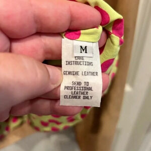 Euc with fun lime green and pink lining. Genuine leather. Size medium. No flaws, save for a potential small mark on the back as seen in last picture. May just be a result of the staining process of the leather but wanted to point it out. Not noticeable at all.