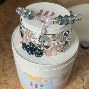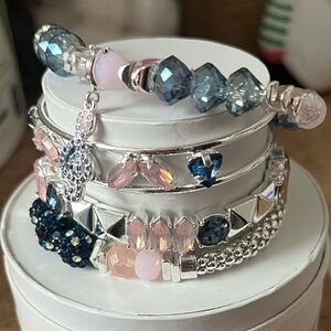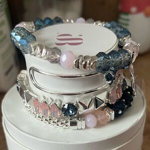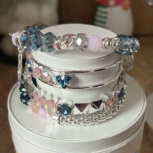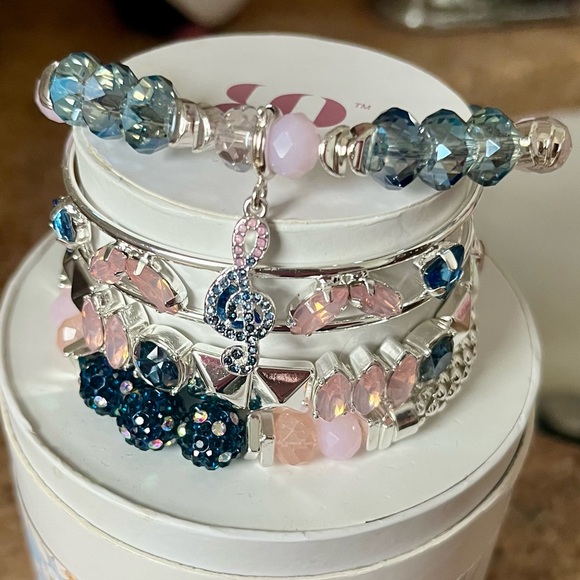 A sparkling stacked bracelet set featuring pink and blue crystals for a chic, feminine look. Silver-tone accents and a blue-and-pink treble-clef charm add playful detail. Layered design offers easy styling for everyday or special occasions. Includes pink and blue colorway for versatile wear. Brand new in original box!