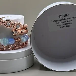 Elegant bracelet set with rose gold plating and lab created stones. Features intricate designs and blue accents.
