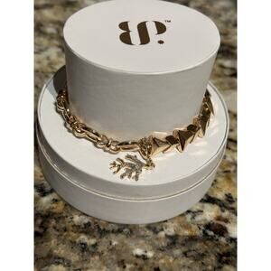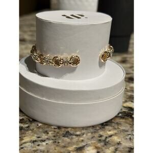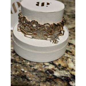 The Bomb Party Spring Stacks 2025 ST23512 Seaside Glamour bracelet features a cuff style design, a stretchy bracelet with charm accents, and a pull chain. It is made of gold plated metal and adorned with assorted gemstones, offering a touch of elegance and glamour to any outfit. Perfect for those who appreciate unique and eye-catching accessories that spark a sense of style and sophistication.