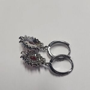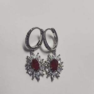 These stunning earrings feature a vibrant red glass gemstone surrounded by sparkling accents, set in a sleek silver design. Perfect for adding a touch of elegance to any outfit.