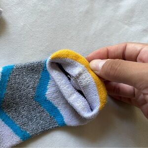Comfortable purple ankle socks featuring blue and yellow accents. Perfect for everyday wear.